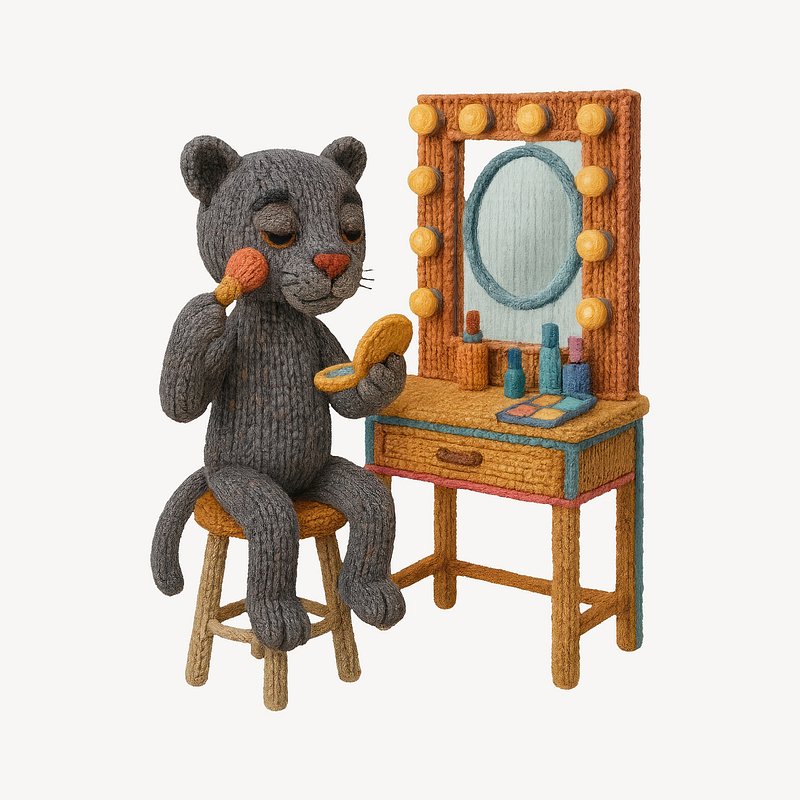 Knitted cat applying makeup joyfully. https://www.rawpixel.com/image/24658150/knitted-cat-applying-makeup-joyfullyView license