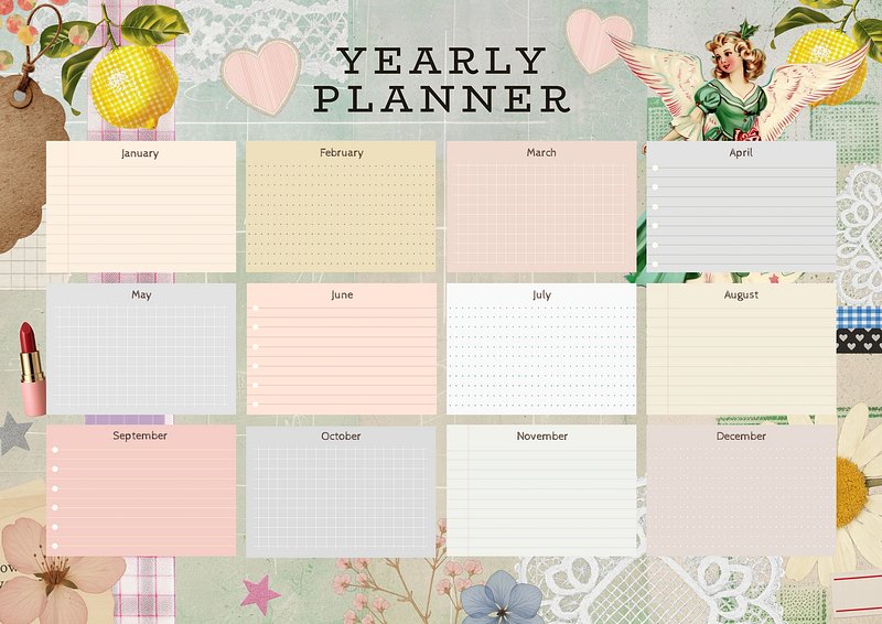 Vintage yearly planner template https://www.rawpixel.com/image/25830292/vintage-yearly-planner-templateView license