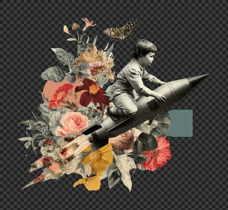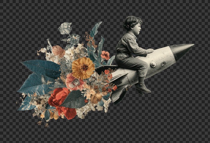 PNG Child rides rocket through flowers. https://www.rawpixel.com/image/25989240/png-child-rides-rocket-through-flowersView license