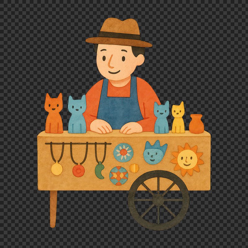 PNG Whimsical vendor with colorful crafts. https://www.rawpixel.com/image/19058287/png-whimsical-vendor-with-colorful-craftsView license