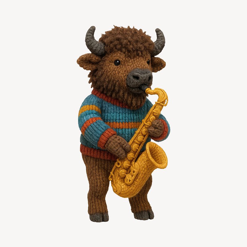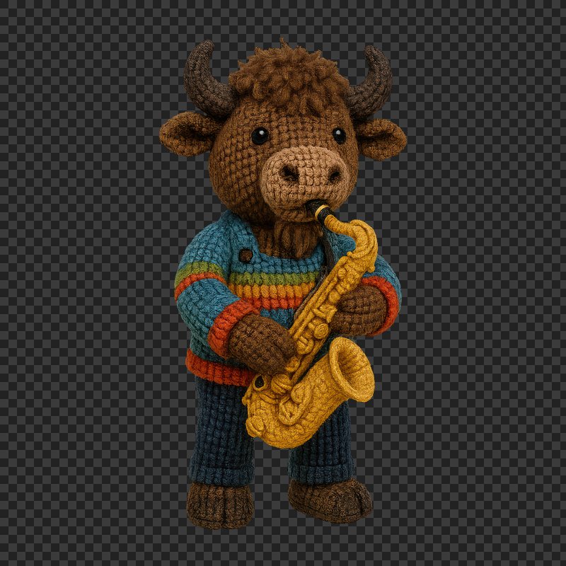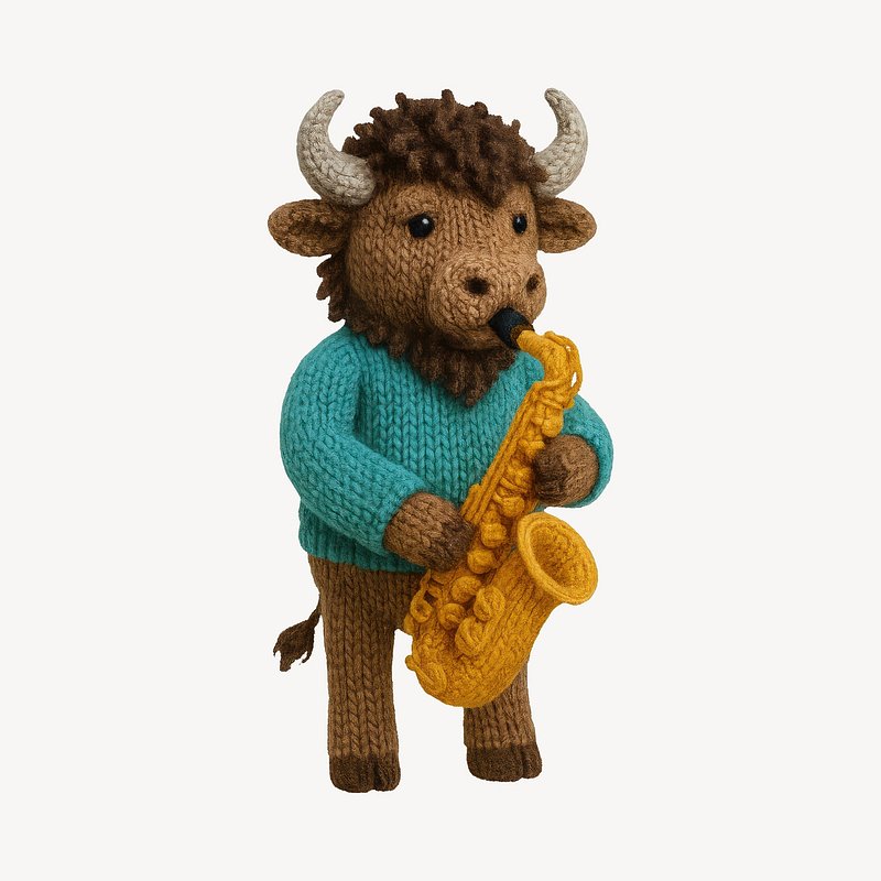 Knitted bison playing saxophone https://www.rawpixel.com/image/24530172/knitted-bison-playing-saxophoneView license