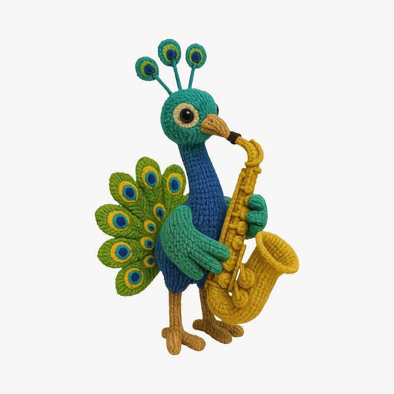 Crochet peacock playing saxophone https://www.rawpixel.com/image/24608473/crochet-peacock-playing-saxophoneView license