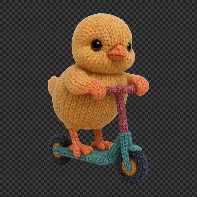 PNG Knitted chick riding scooter. https://www.rawpixel.com/image/24443757/png-knitted-chick-riding-scooterView license
