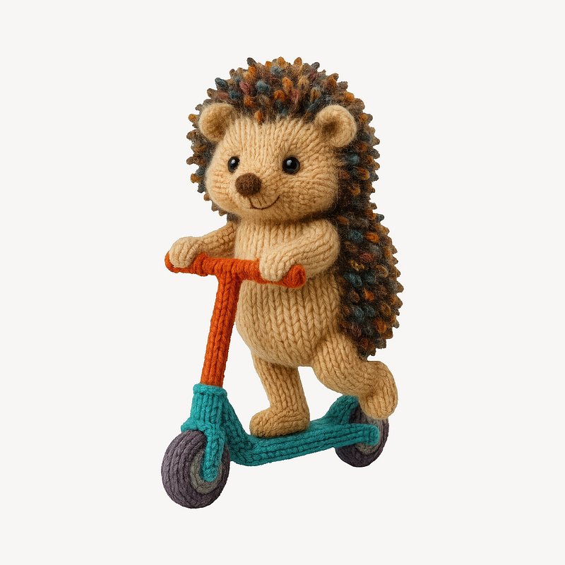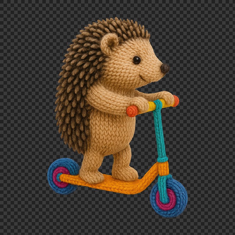 PNG Knitted hedgehog riding scooter. https://www.rawpixel.com/image/24478485/png-knitted-hedgehog-riding-scooterView license