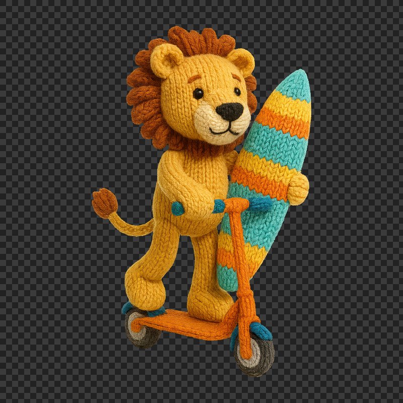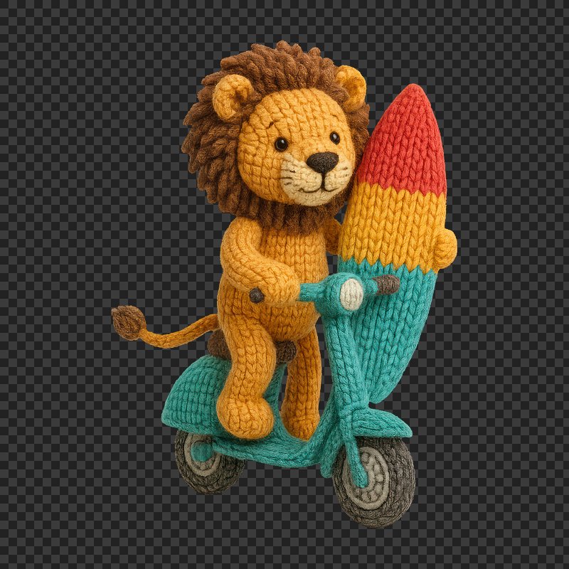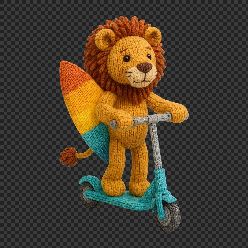 PNG Knitted lion rides scooter. https://www.rawpixel.com/image/24479476/png-knitted-lion-rides-scooterView license
