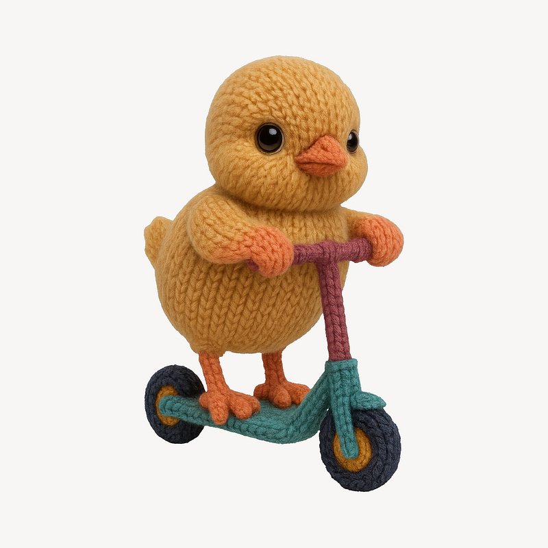 Knitted chick riding scooter. https://www.rawpixel.com/image/24530140/knitted-chick-riding-scooterView license