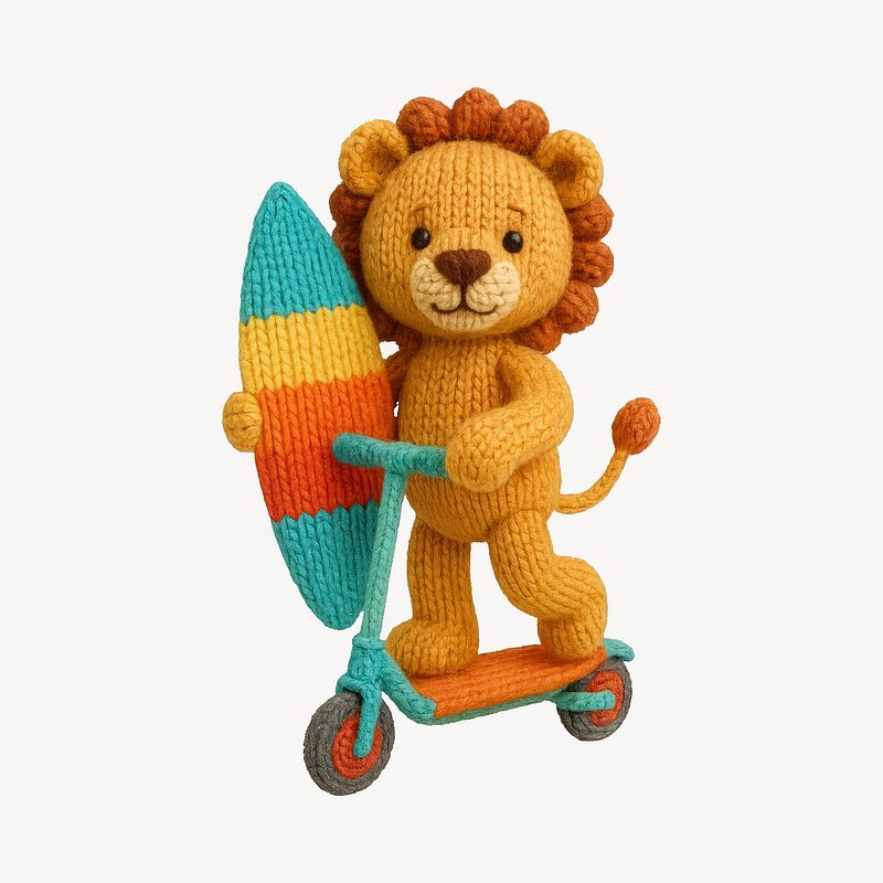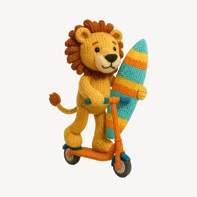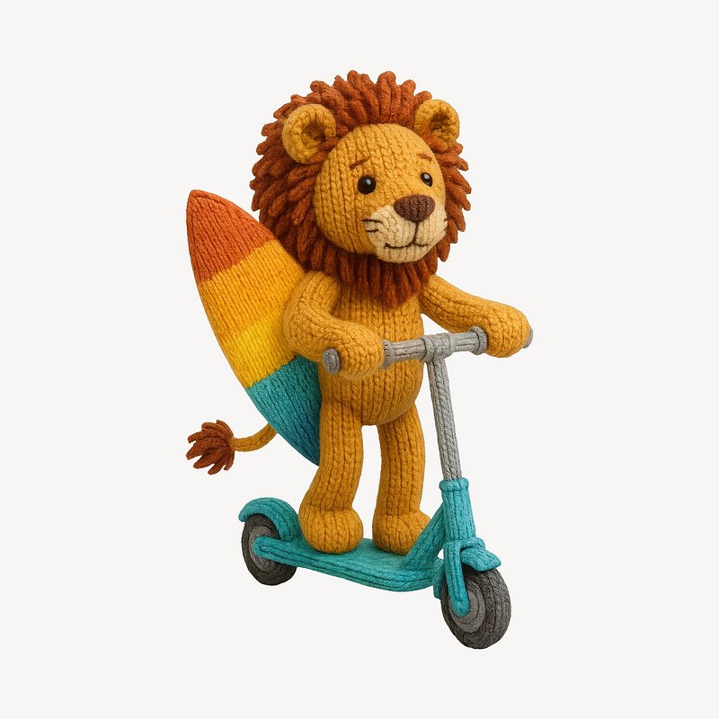 Knitted lion rides scooter. https://www.rawpixel.com/image/24609749/knitted-lion-rides-scooterView license