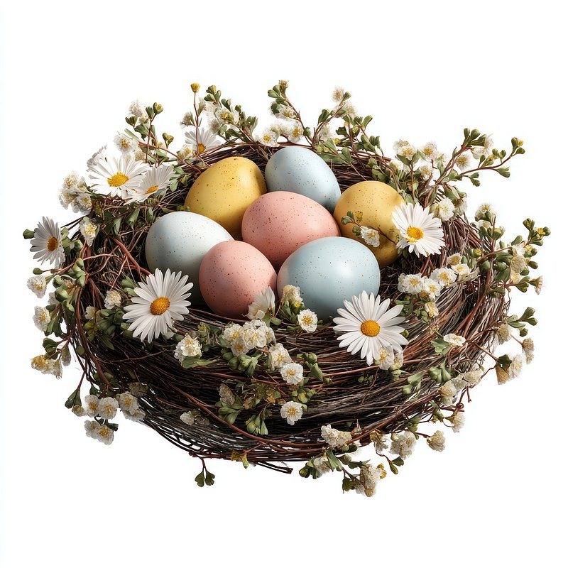Colorful eggs in floral nest. https://www.rawpixel.com/image/24938772/colorful-eggs-floral-nestView license