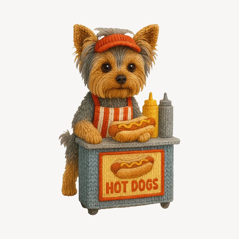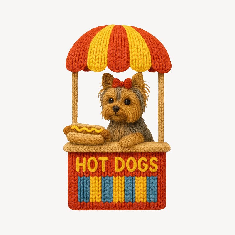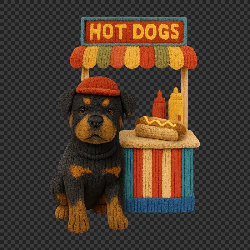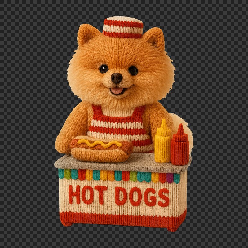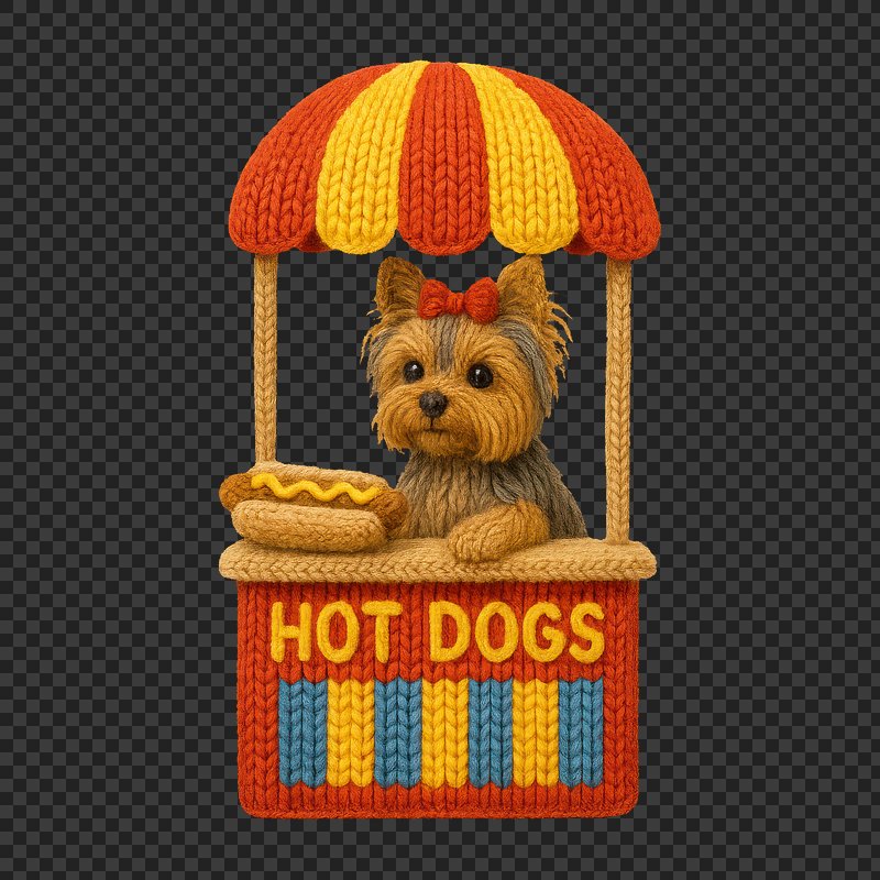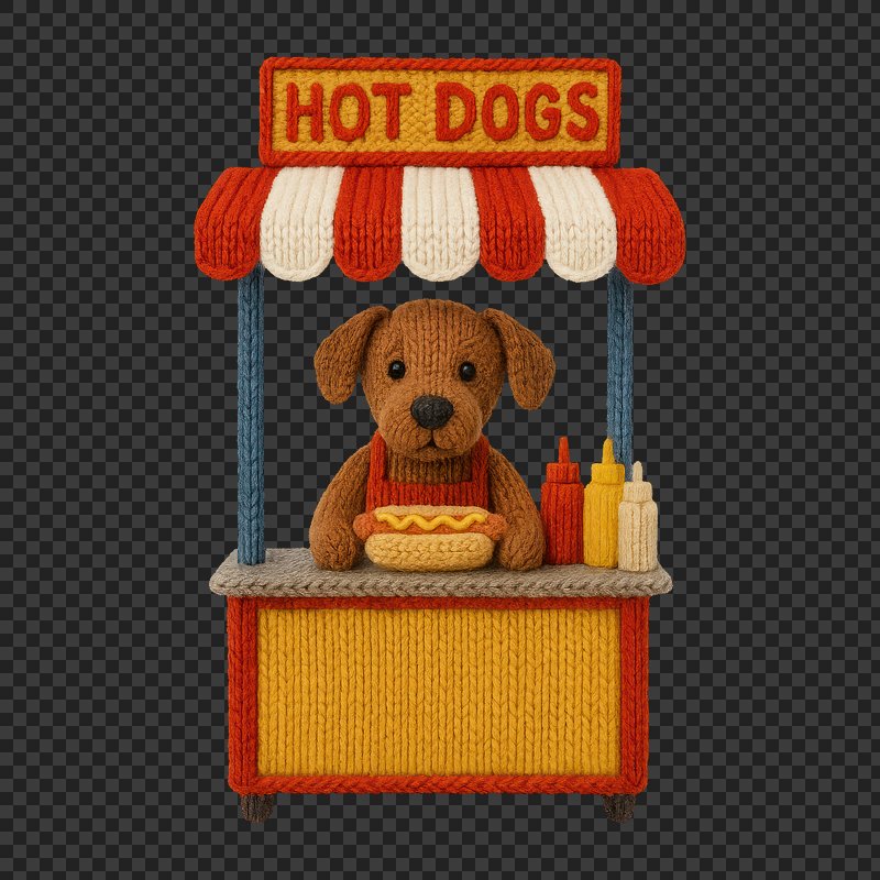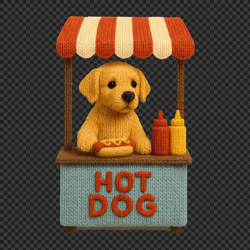 PNG Cute knitted dog selling hot dogs. https://www.rawpixel.com/image/24441857/png-cute-knitted-dog-selling-hot-dogsView license