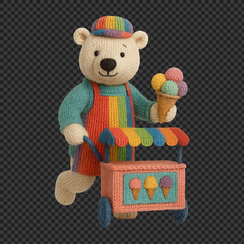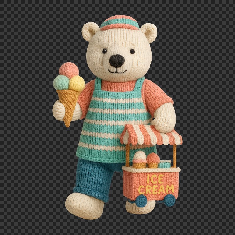PNG Knitted bear selling ice cream. https://www.rawpixel.com/image/24521929/png-knitted-bear-selling-ice-creamView license