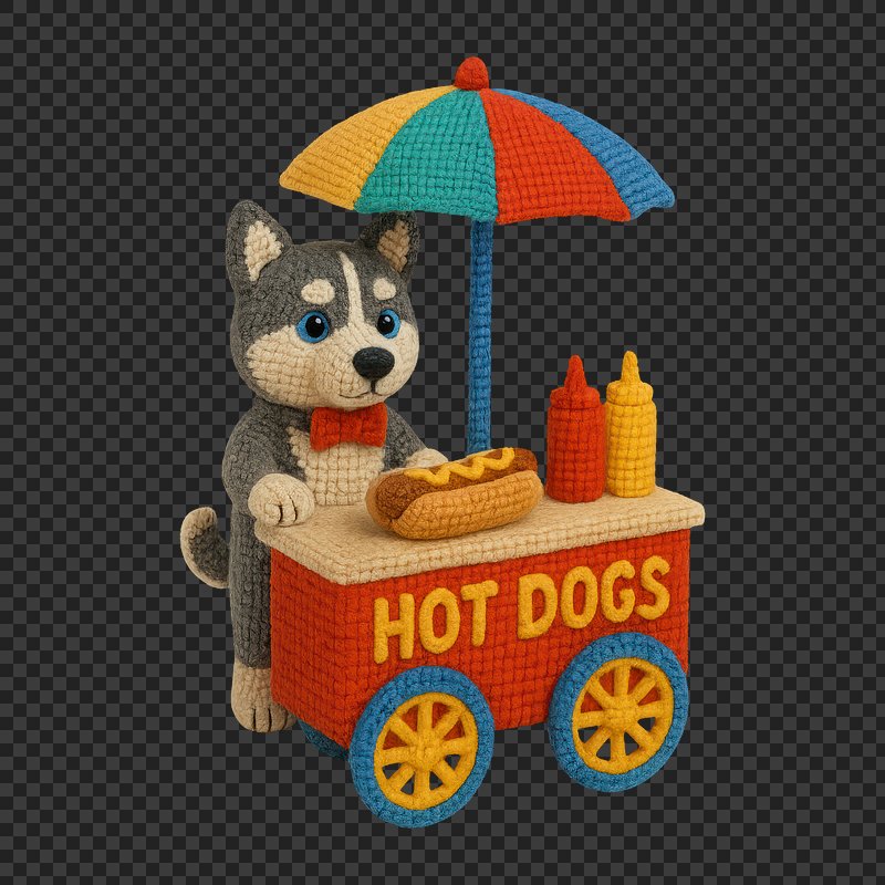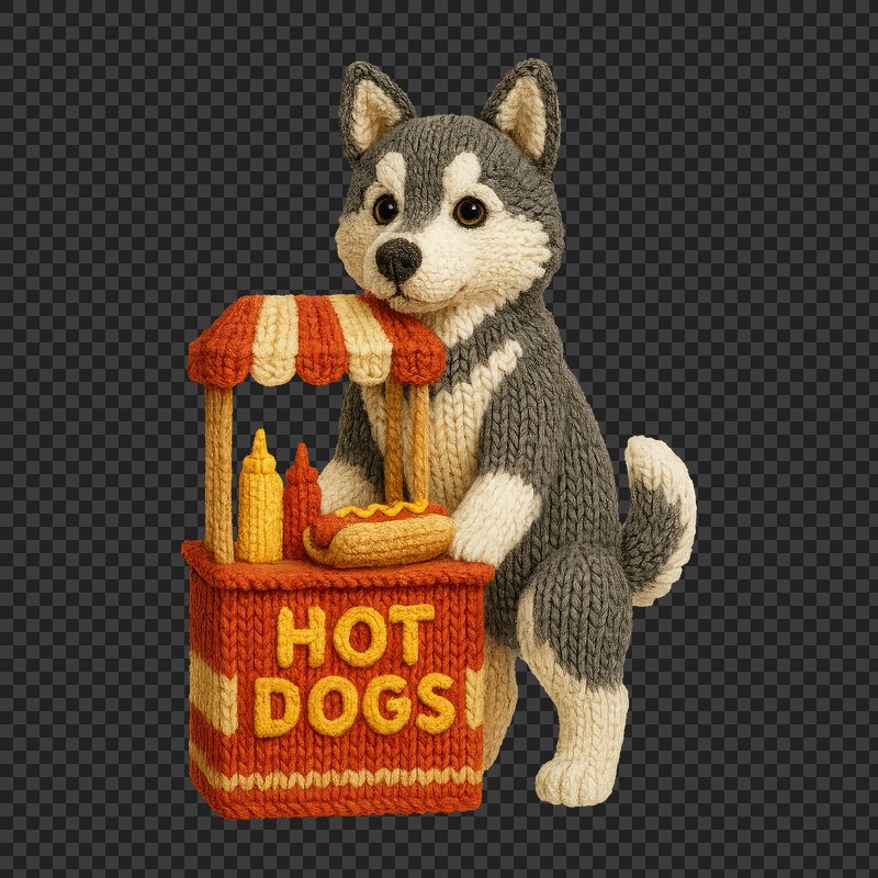 PNG Knitted husky selling hot dogs. https://www.rawpixel.com/image/24521116/png-knitted-husky-selling-hot-dogsView license