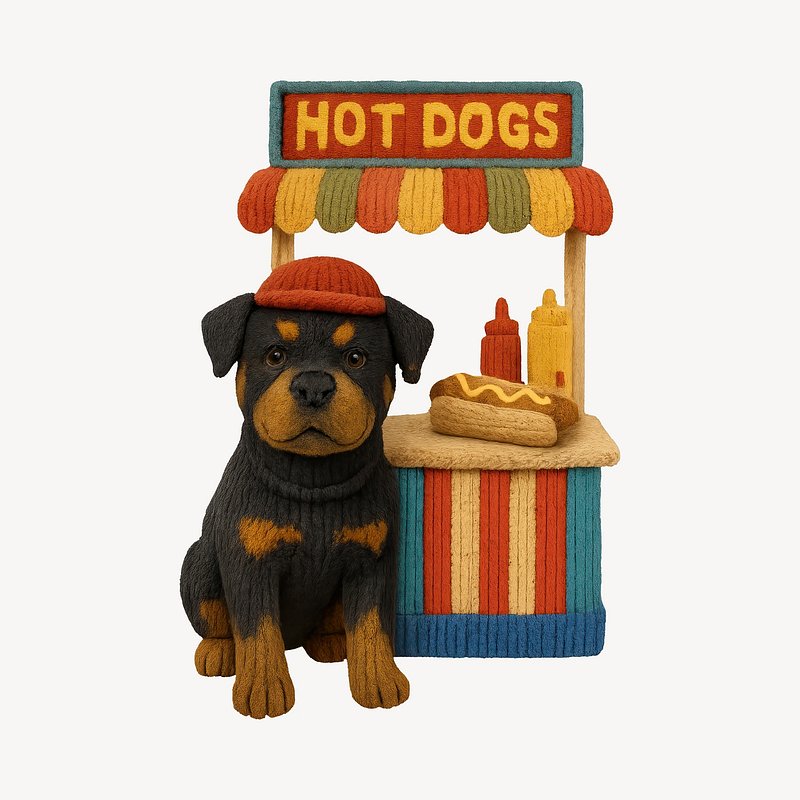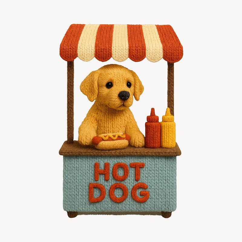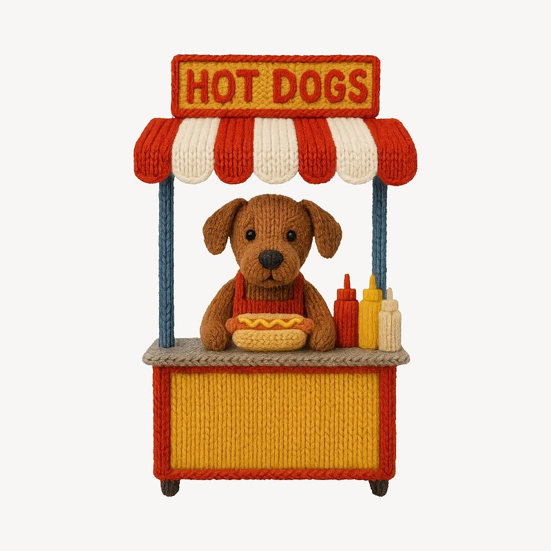 Cute knitted dog selling hot dogs. https://www.rawpixel.com/image/24534204/cute-knitted-dog-selling-hot-dogsView license