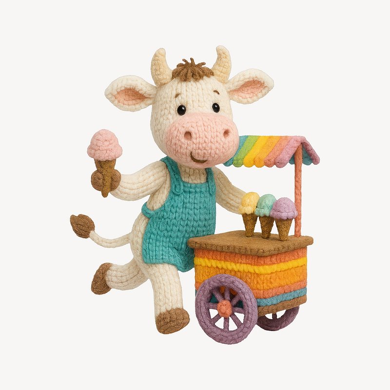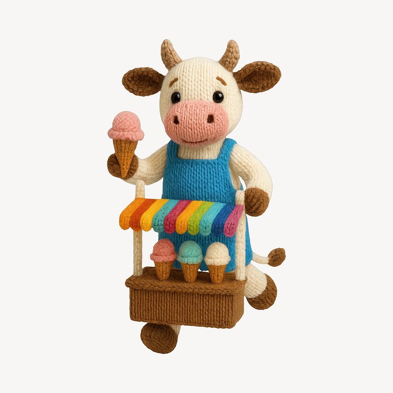 Crochet cow selling ice cream. https://www.rawpixel.com/image/24534208/crochet-cow-selling-ice-creamView license