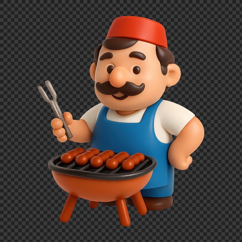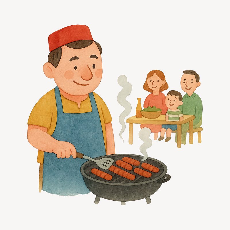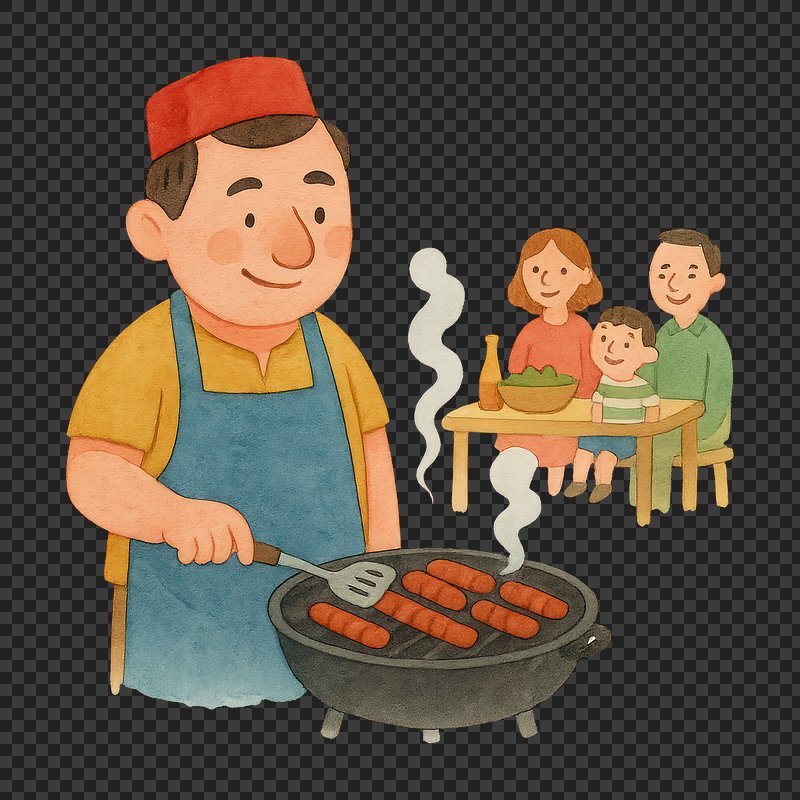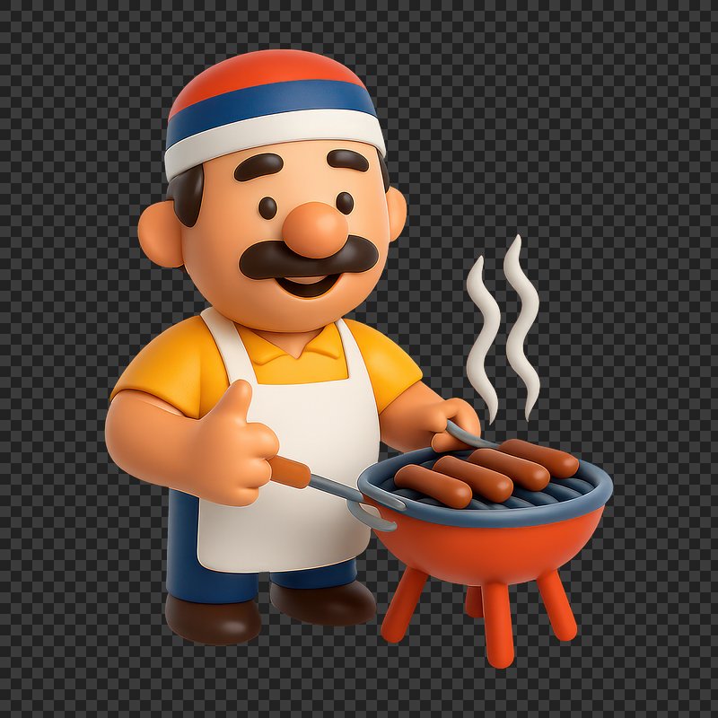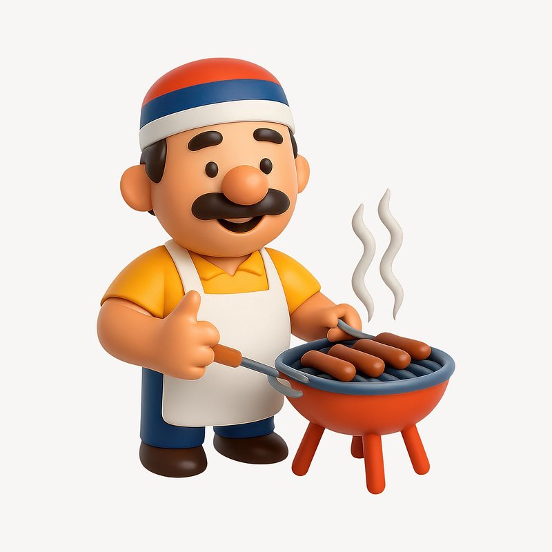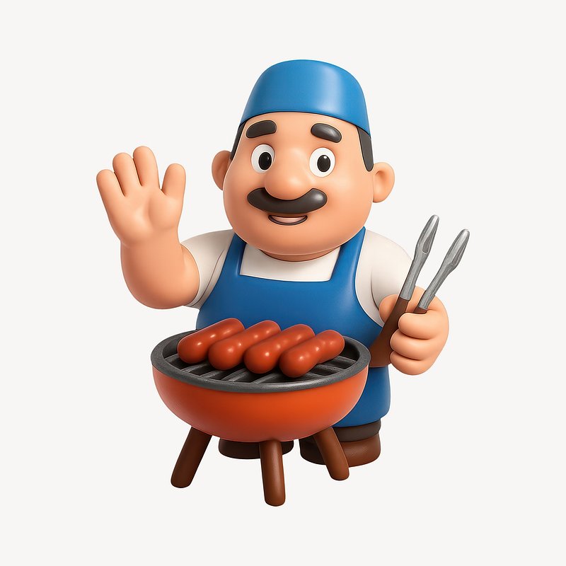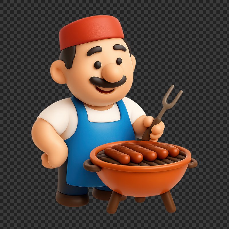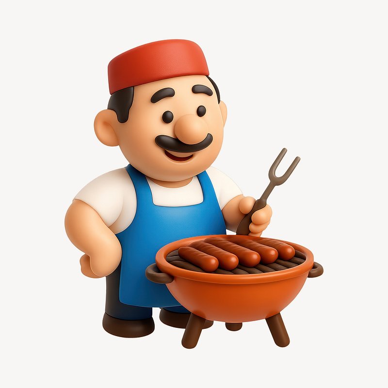 Cartoon chef grilling sausages outdoors. https://www.rawpixel.com/image/20713912/cartoon-chef-grilling-sausages-outdoorsView license