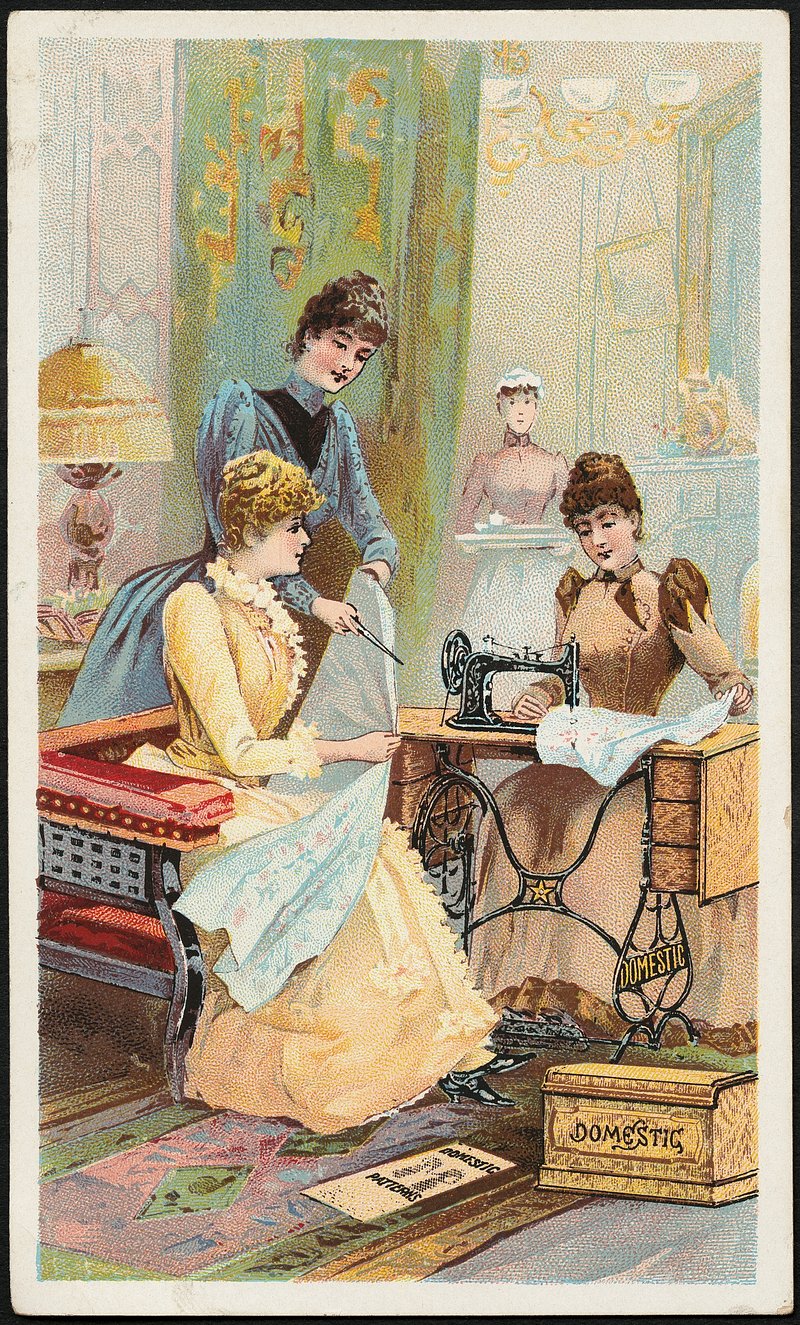 A woman is sitting sewing a piece of ribbon onto lace. Coloured lithograph. https://www.rawpixel.com/image/13956611/woman-sitting-sewing-piece-ribbon-onto-lace-coloured-lithographFree Image from public domain license