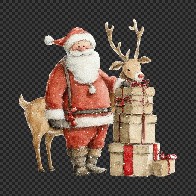 PNG Santa with reindeer gifts illustration. https://www.rawpixel.com/image/24018364/png-santa-with-reindeer-gifts-illustrationView license