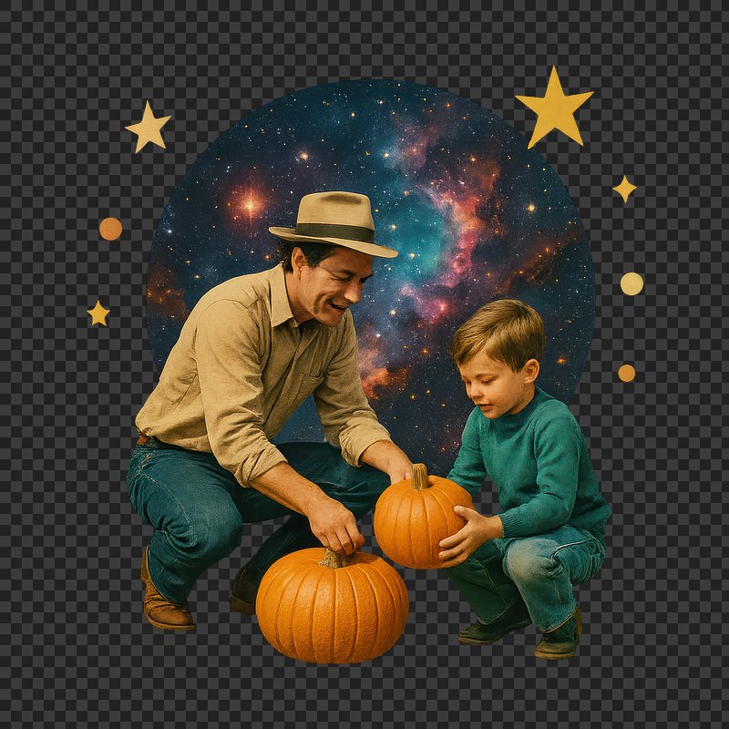 PNG Father son pumpkins cosmic collage https://www.rawpixel.com/image/24269401/png-father-son-pumpkins-cosmic-collageView license