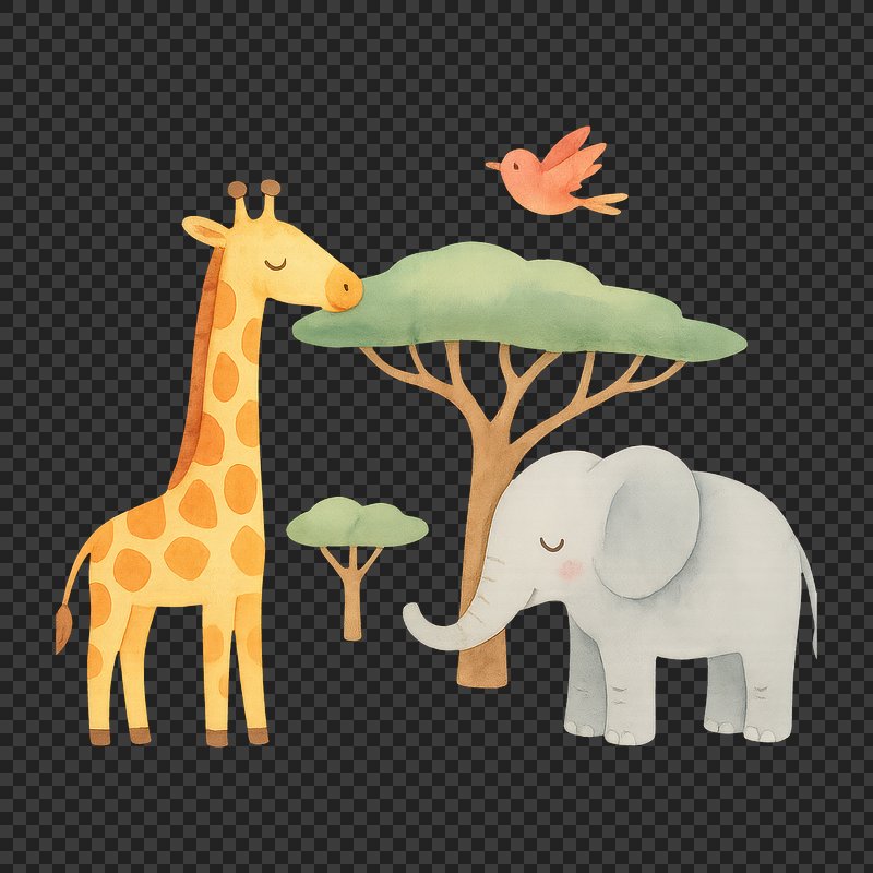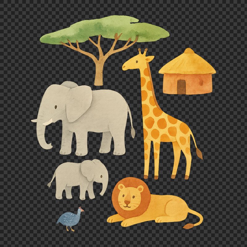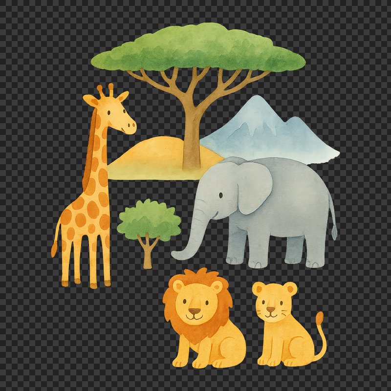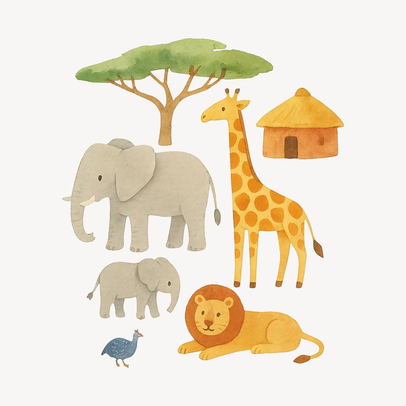 PNG Cute safari animals watercolor illustration. https://www.rawpixel.com/image/18709331/png-cute-safari-animals-watercolor-illustrationView license