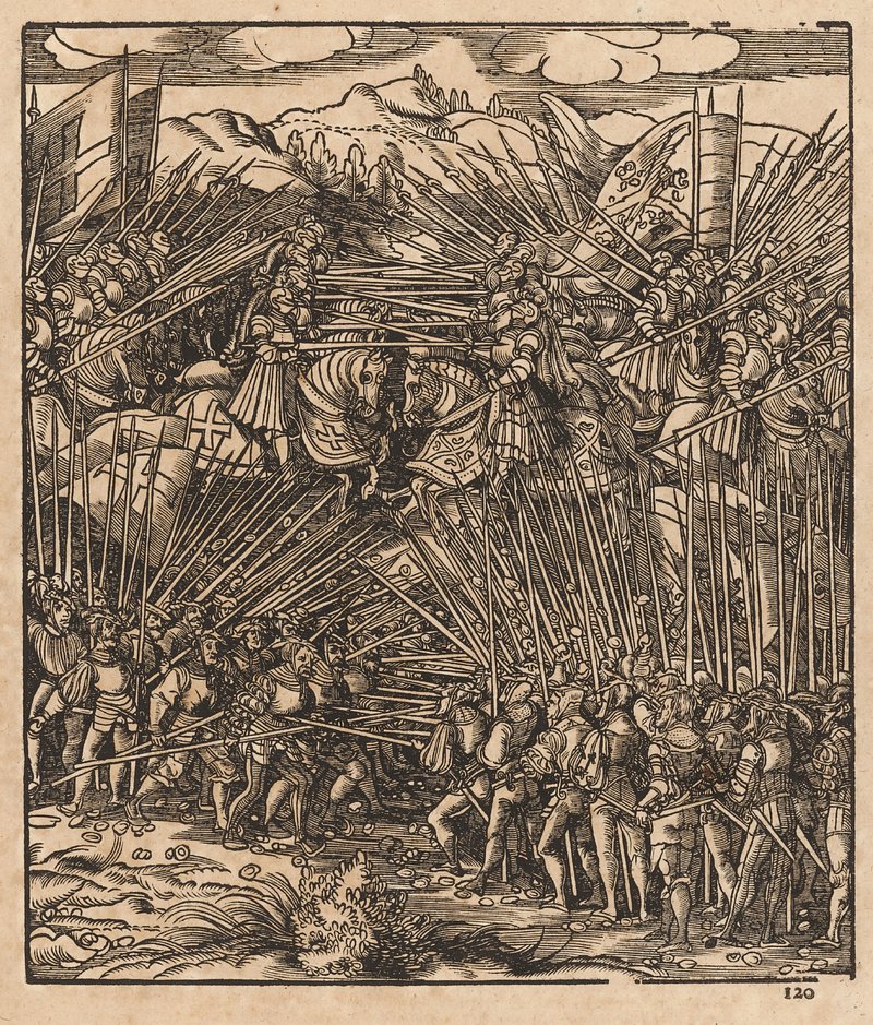 The battle at Issus in 333 BC: Alexander the Great of Macedonia is chasing the fleeing Darius III. Coloured etching. https://www.rawpixel.com/image/13968840/image-arrow-cat-horseFree Image from public domain license