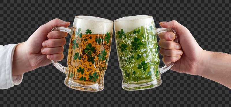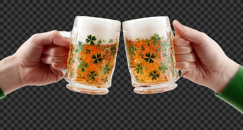 PNG Festive clover beer mugs clinking. https://www.rawpixel.com/image/25247345/png-festive-clover-beer-mugs-clinkingView license