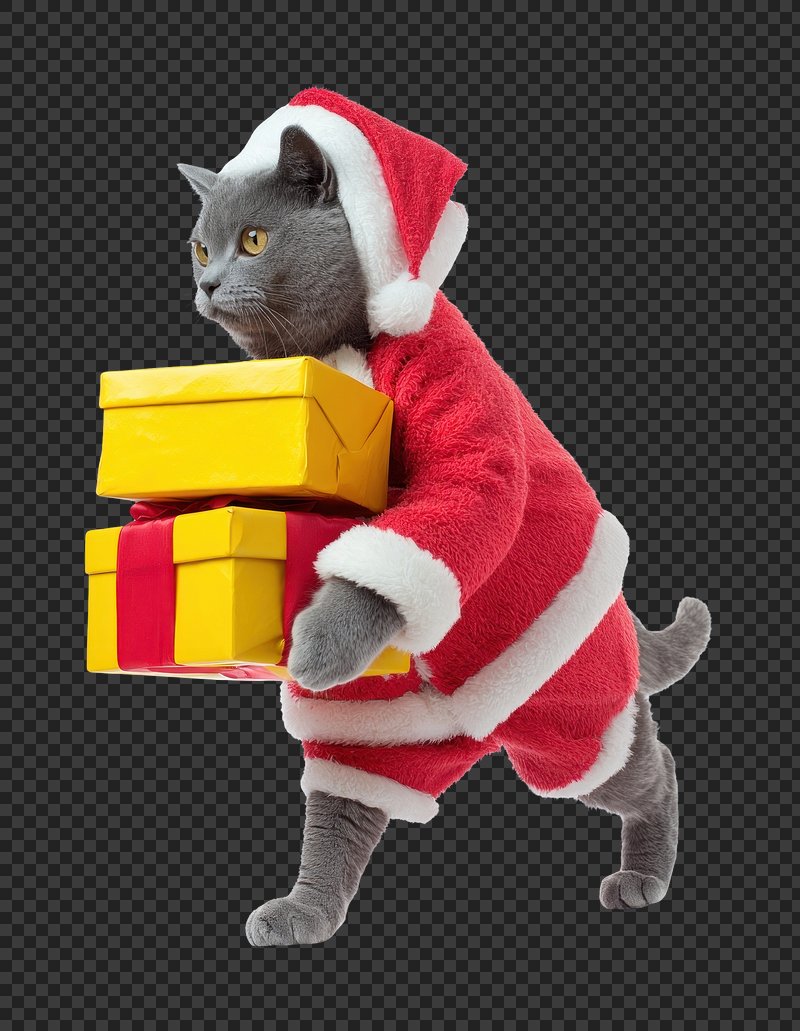PNG Cat dressed as Santa delivering gifts. https://www.rawpixel.com/image/24020774/png-cat-dressed-santa-delivering-giftsView license