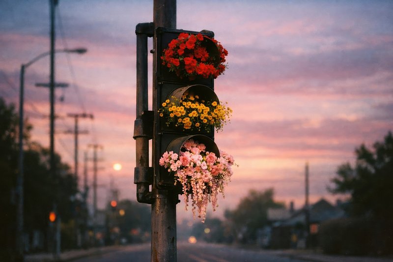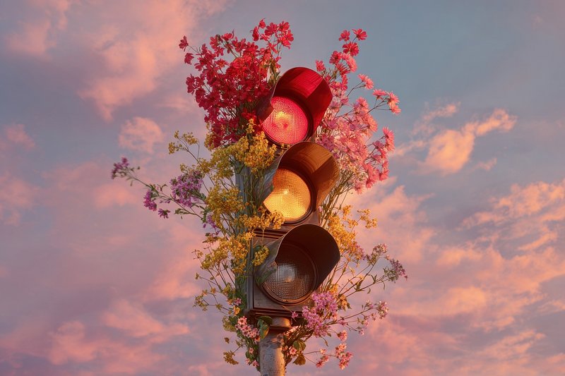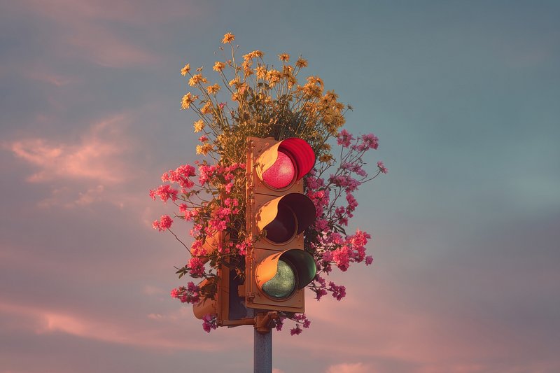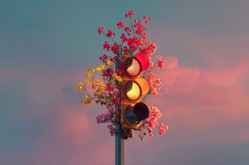 Traffic light adorned with flowers. https://www.rawpixel.com/image/25612154/photo-image-texture-clouds-sunsetView license