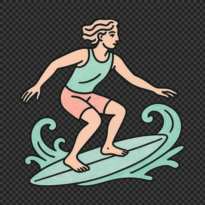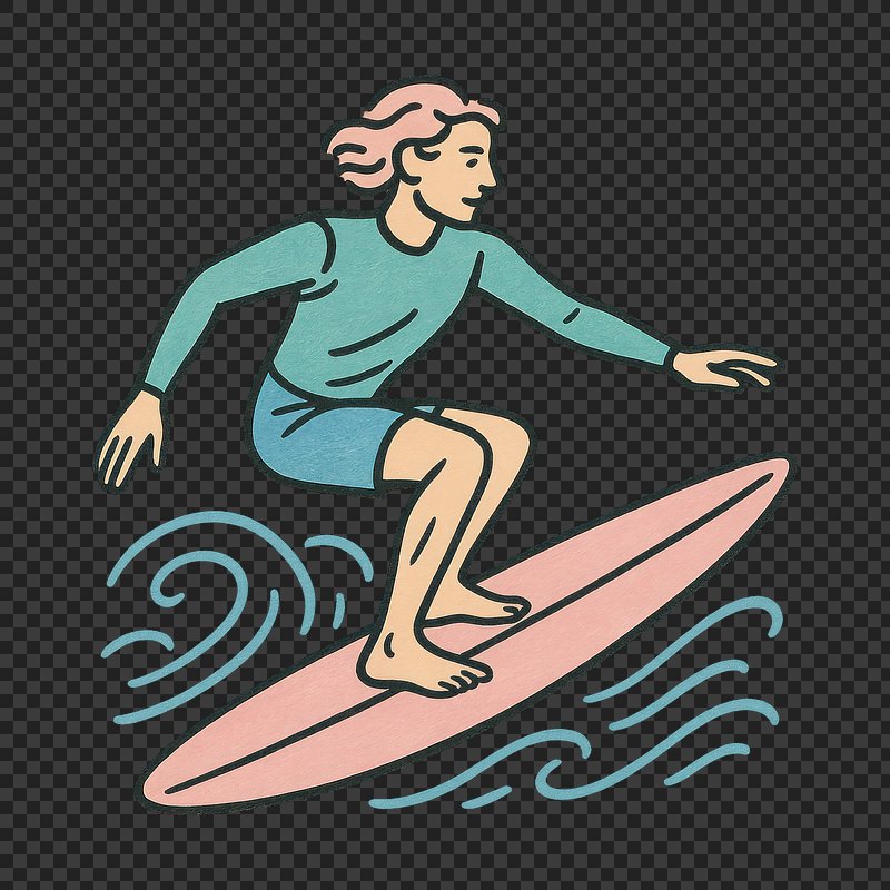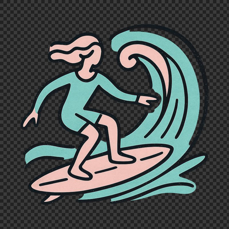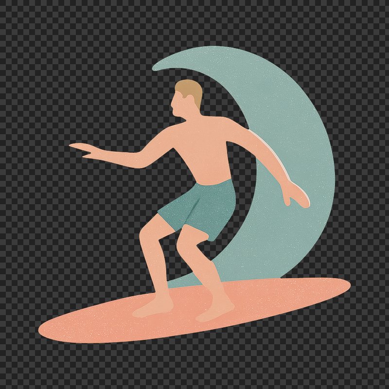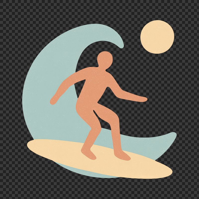 Minimalist cartoon surfer riding wave. https://www.rawpixel.com/image/24598813/image-background-png-shadowView license
