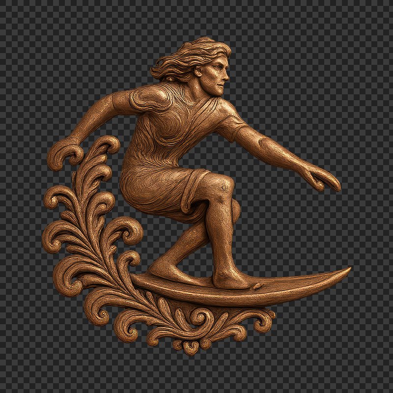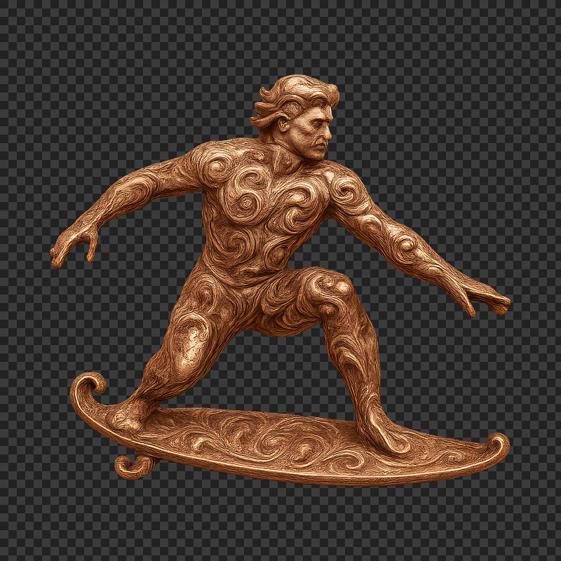 PNG Bronze surfer riding ornate wave. https://www.rawpixel.com/image/24297960/png-bronze-surfer-riding-ornate-waveView license