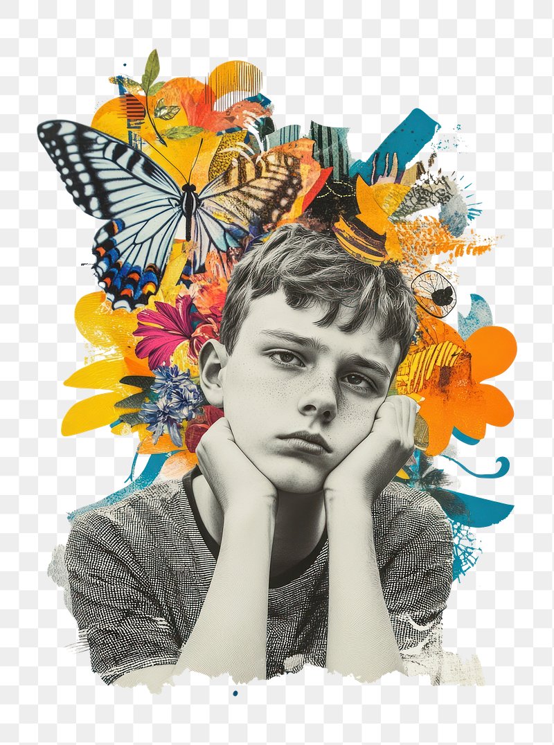 PNG Paper collage of boy thinking portrait butterfly colorful. https://www.rawpixel.com/image/16860799/png-paper-collage-boy-thinking-portrait-butterfly-colorfulView license