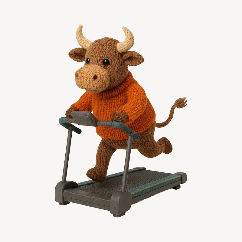 Knitted bull exercising on treadmill. https://www.rawpixel.com/image/24534406/knitted-bull-exercising-treadmillView license