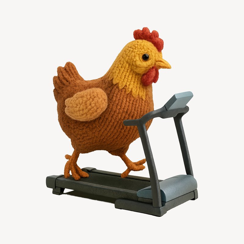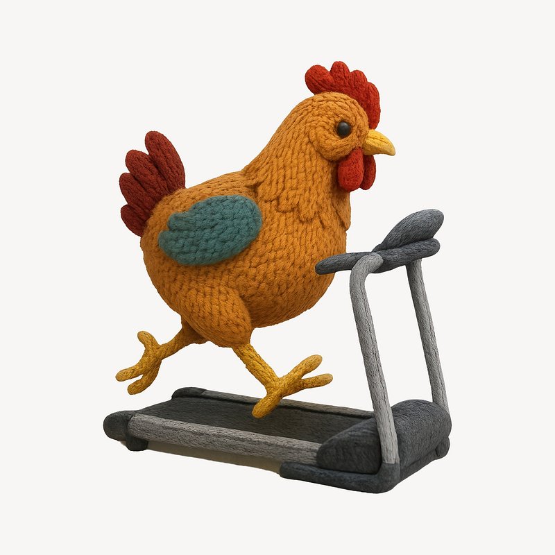 Knitted chicken exercising treadmill. https://www.rawpixel.com/image/24532323/knitted-chicken-exercising-treadmillView license