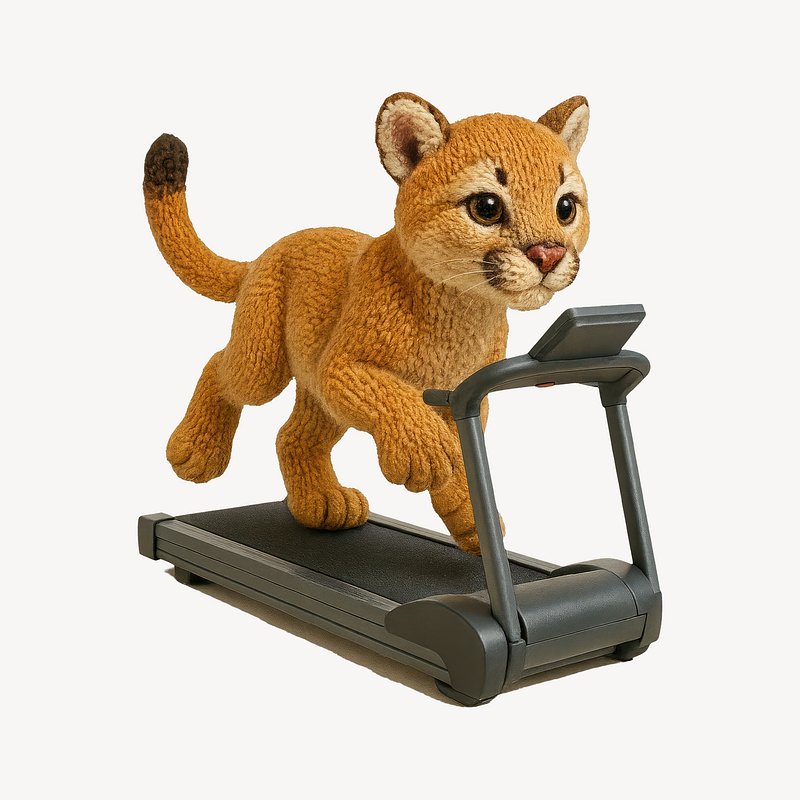 Knitted lion cub exercising treadmill https://www.rawpixel.com/image/24608164/knitted-lion-cub-exercising-treadmillView license