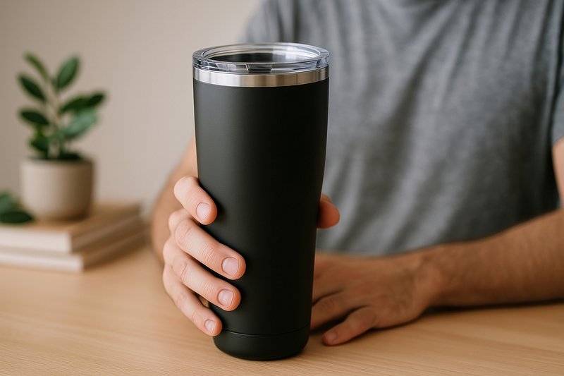 Sleek insulated tumbler held casually. https://www.rawpixel.com/image/17363457/sleek-insulated-tumbler-held-casuallyView license