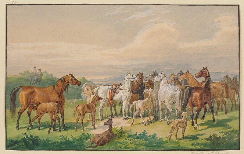 Ein gesatteltes Militärpferd kehrt zu seiner wilden Herde zurück, null by johann erdmann gottlieb prestel https://www.rawpixel.com/image/18946637/image-horses-scenery-animals Free Image from public domain license