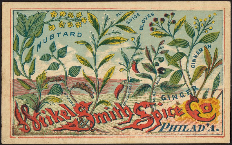 Weikel & Smith Spice Co., Philad'a. Mustard, all spice, cloves, cinnamon, pepper, cayenne pepper, numegs, mace, ginger https://www.rawpixel.com/image/8906941/image-plants-art-vintageFree Image from public domain license