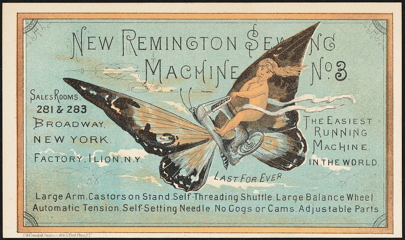 New Remington sewing machine no. 3. The easiest running machine in the world. Last for ever https://www.rawpixel.com/image/8908735/image-arts-vintage-public-domainFree Image from public domain license