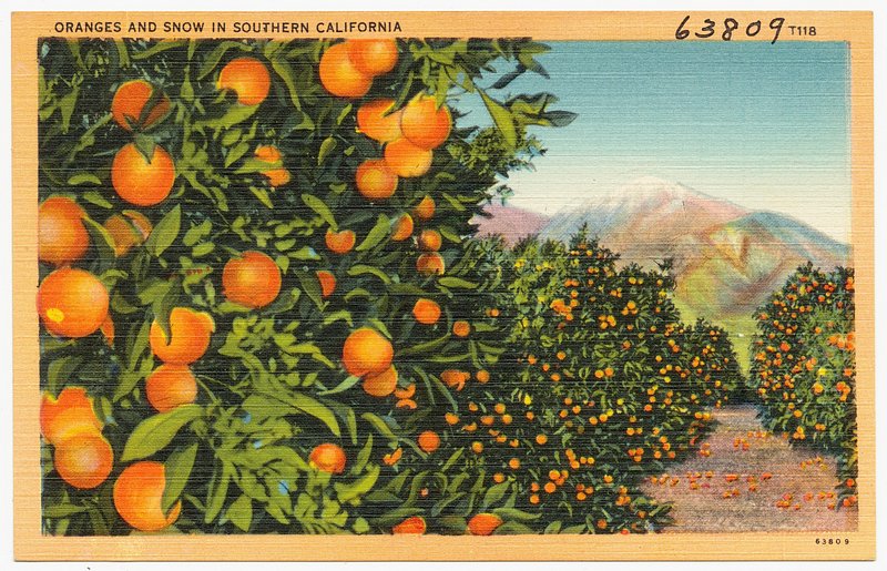 A California Anomaly, Snow and Oranges, Pasadena, California, No. 7782, Detroit Publishing Company (American) https://www.rawpixel.com/image/9086376/image-vintage-postcard-californiaFree Image from public domain license