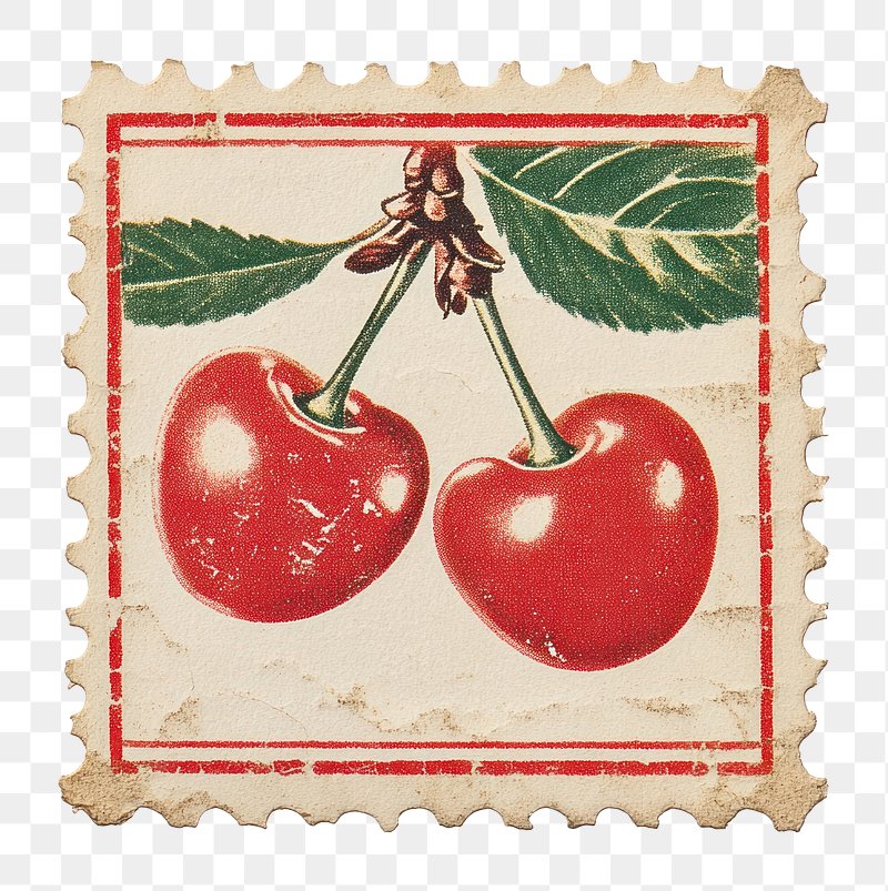 PNG Cherry postage stamp vintage fruit illustration. https://www.rawpixel.com/image/16831175/png-cherry-postage-stamp-vintage-fruit-illustrationView license