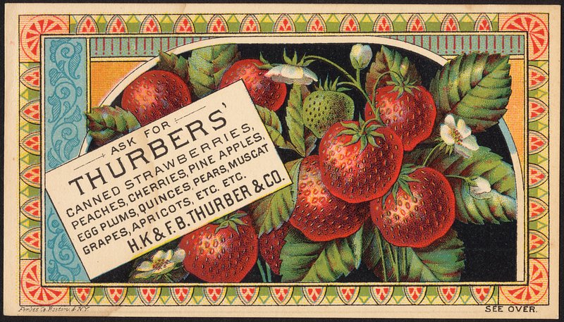 Ask for Thurbers' canned strawberries, peaches, cherries, pineapples, egg plums, quinces, pears, apricots, etc. etc. https://www.rawpixel.com/image/8908016/image-plant-arts-vintageFree Image from public domain license