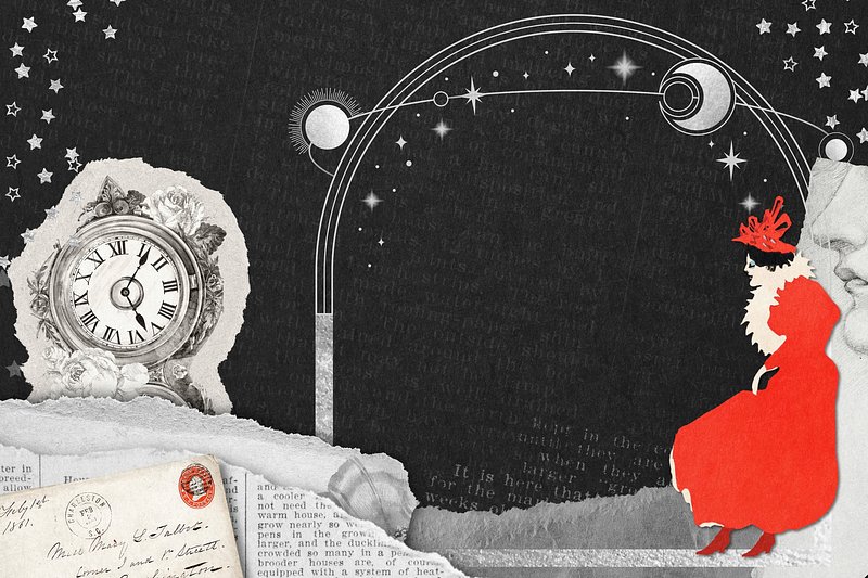Retro collage with vintage elements: clock, celestial motifs, and red silhouette design https://www.rawpixel.com/image/22798815/image-background-star-transparent-pngView license