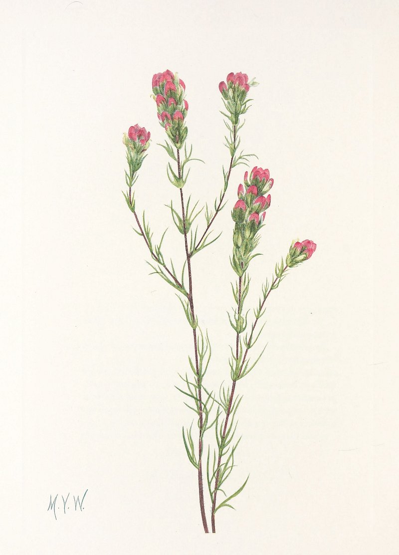 Owl-Clover from North American Wildflowers (1925) by Mary Vaux Walcott. https://www.rawpixel.com/image/16757739/owl-clover-from-north-american-wildflowers-1925-mary-vaux-walcottFree Image from public domain license