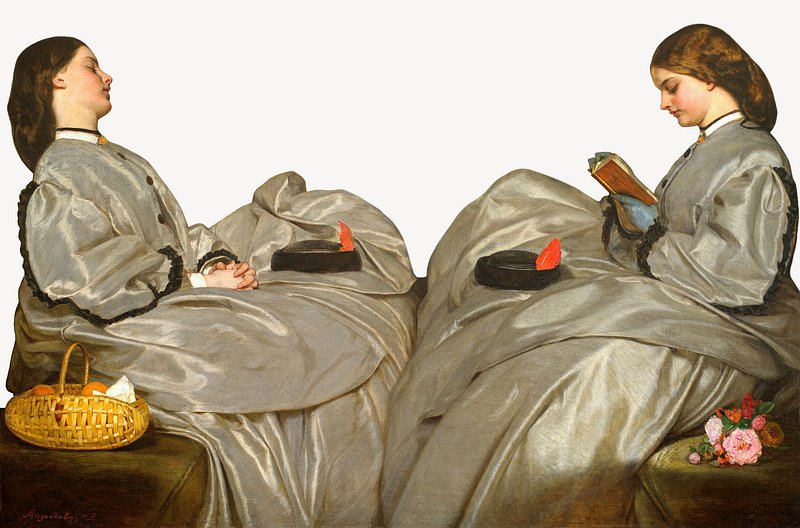 The Travelling Companions (1862) by Augustus Leopold Egg, vintage illustration psd. Remixed by rawpixel. https://www.rawpixel.com/image/25479956/psd-image-background-book-personView license