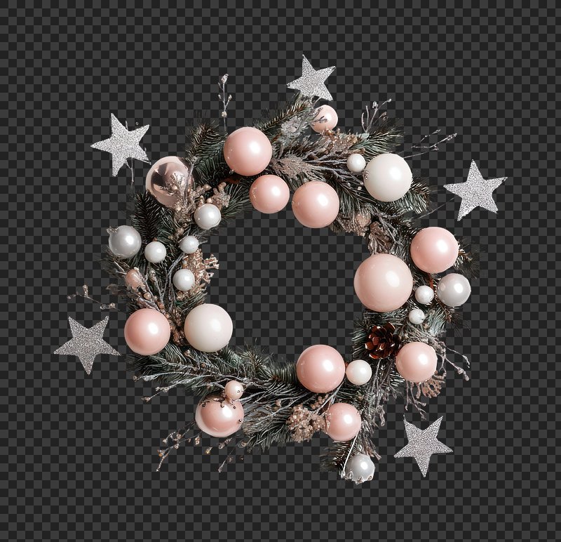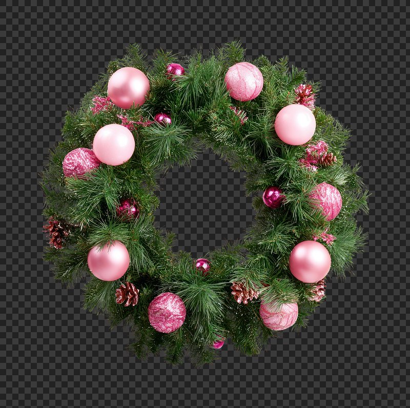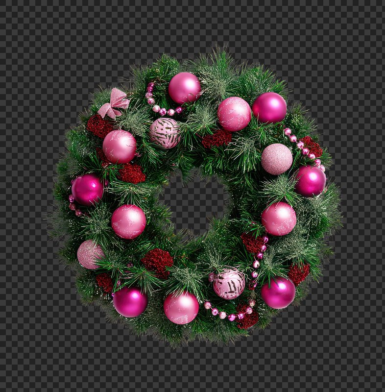 PNG Festive wreath with pink ornaments. https://www.rawpixel.com/image/22937167/png-festive-wreath-with-pink-ornamentsView license
