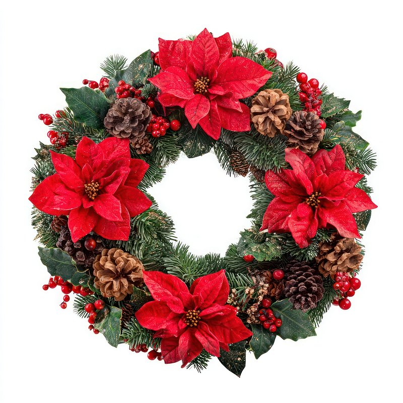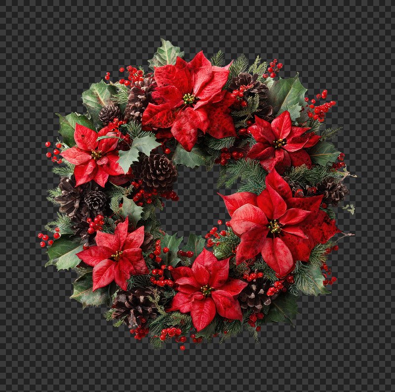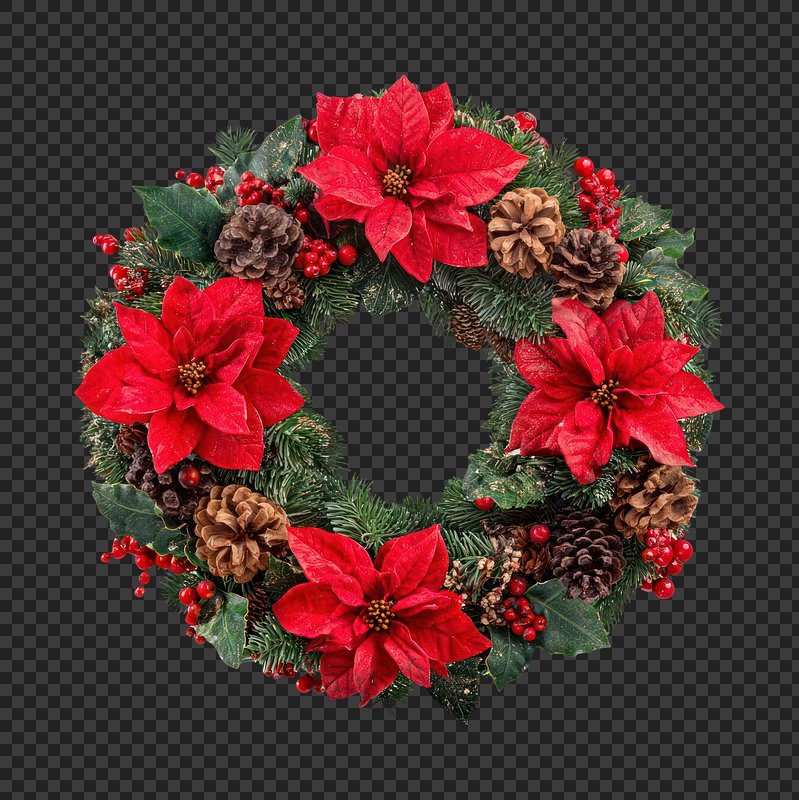 PNG Festive wreath with red poinsettias. https://www.rawpixel.com/image/22940681/png-festive-wreath-with-red-poinsettiasView license