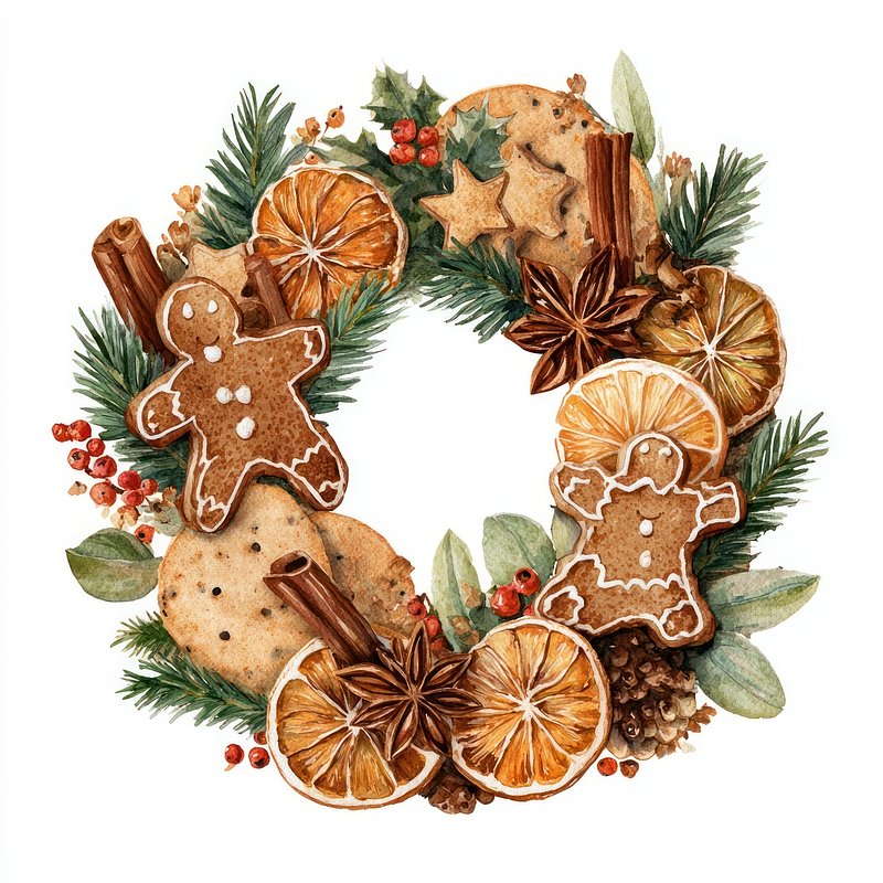 PNG Festive wreath with gingerbread cookies. https://www.rawpixel.com/image/24021318/png-festive-wreath-with-gingerbread-cookiesView license