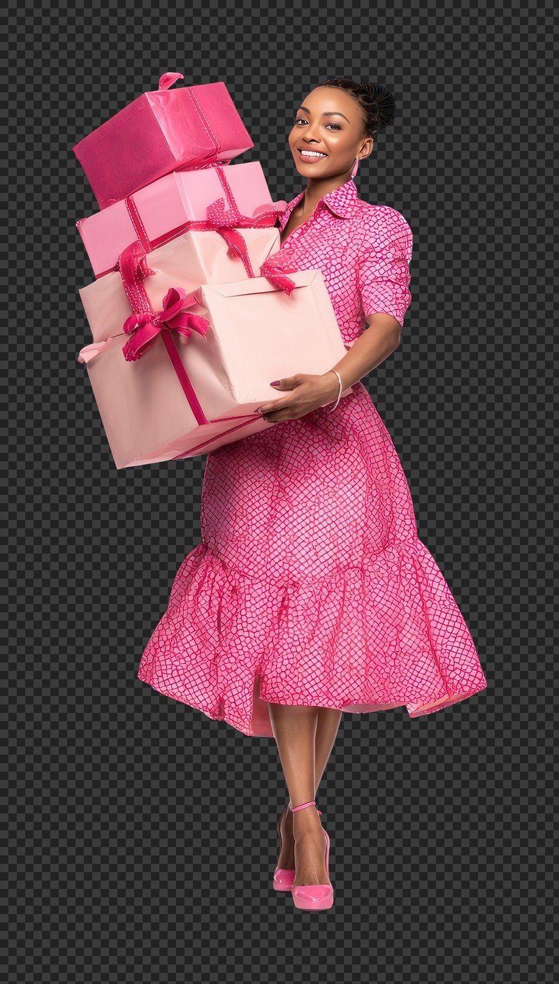 PNG Joyful woman holding pink gifts. https://www.rawpixel.com/image/20884928/png-joyful-woman-holding-pink-giftsView license