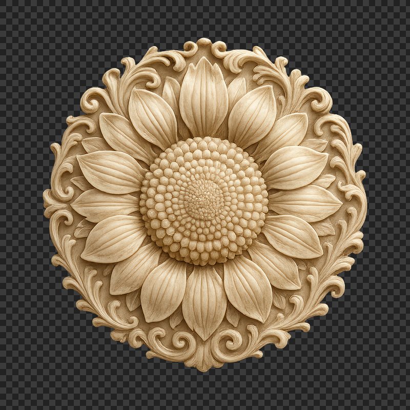 PNG Intricate wooden sunflower carving design. https://www.rawpixel.com/image/24323833/png-intricate-wooden-sunflower-carving-designView license