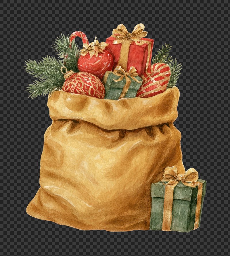 PNG Festive sack with holiday gifts. https://www.rawpixel.com/image/24017899/png-festive-sack-with-holiday-giftsView license
