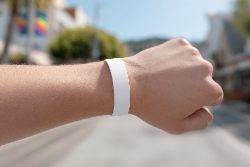 Man wearing white empty paper wristband outdoors hand arm. https://www.rawpixel.com/image/14428461/man-wearing-white-empty-paper-wristband-outdoors-hand-armView license