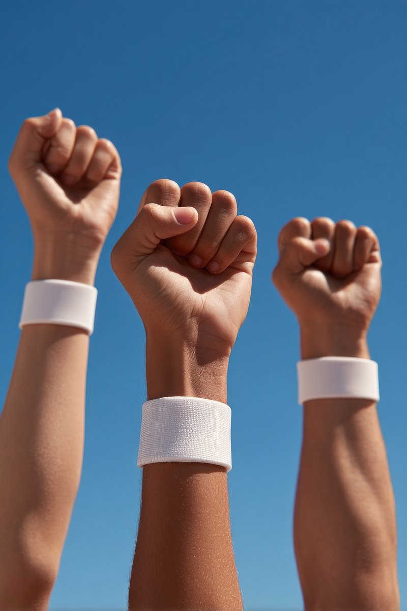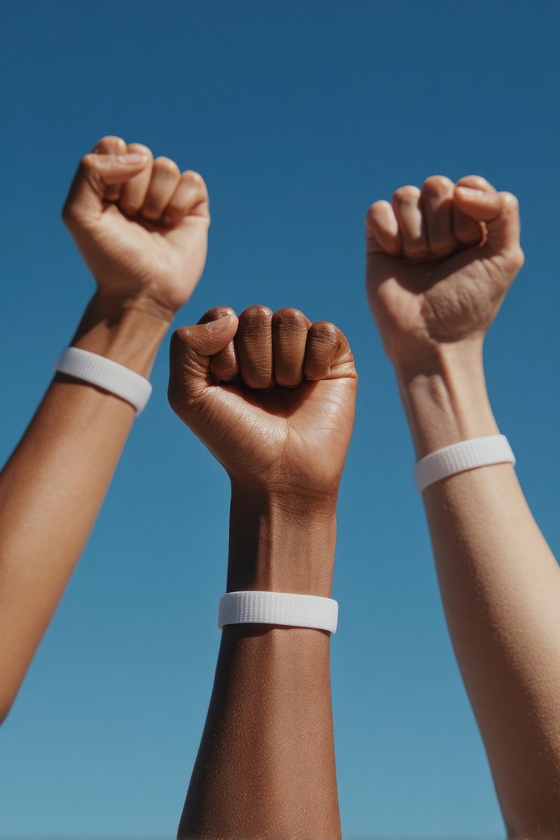 Raised fist with white bracelet. https://www.rawpixel.com/image/25309925/raised-fist-with-white-braceletView license